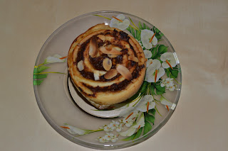 Acum incepe partea fun. Am impartit aluatul in 2. Am intins fiecare bucata de aluat si am pus peste umpluturile- cate una pe fiecare foaie. Am rulat si am taiat bucati groase de 8-10 cm pe care le-am asezat in forme de muffins si le-am ornat cu fulgi de migdale. Le-am copt la 200 grade timp de 20 de minute.